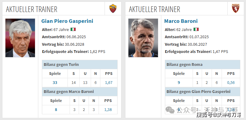 詹皮耶罗·加斯佩里尼(Gian Piero Gasperini)与马尔科·巴罗尼(Marco Baroni)执教水平各有特点。加斯佩里尼执教生涯丰富,在亚特兰大执教时场均得分1.79,带罗马两场场均达3分,不过在国际米兰等队成绩不佳。其整体执教场均得分1.62,对阵都灵PPS1.67,对阵巴罗尼1.38。