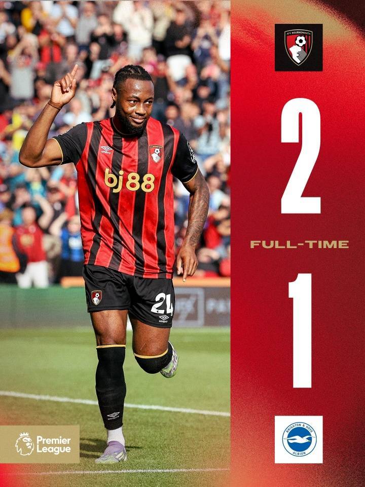 直播吧09月14日讯 英超第4轮,伯恩茅斯2-1击败布莱顿,豪取英超三连胜,升至积分榜第4位。